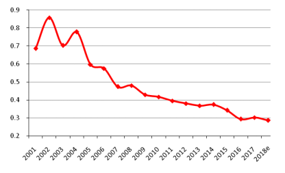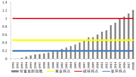 研究發現,貧富差距指數與經濟發展存在這三個拐點:差異拐點(0.2)、黃金拐點(0.463)及破壞拐點(1)。當貧富差距指數在0.2以下的低值區時,絕對平均造成動力不足。當貧富差距指數高于0.2時,差異的動力效應開始顯現,貧富差距指數與GDP增長率存在顯著的倒U型的非線性關系。而且拐點在貧富差距指數等于0.463左右,對應的時間為2006-2007年之間,貧富差距在這個水平左右對經濟增長的動力效應最高。當貧富差距指數低于1時,貧富差距處于合理狀態,合理的貧富差距提高了居民的工作動能,有利于促進經濟增長,但超過臨界值1,隨著貧富差距進一步提高,貧窮人口會有日益強烈的被剝削感,在一定程度上抑制了經濟總量的提升。據此,近年來我國貧富差距的演變過程可以分為四大階段,分別是“財富絕對平均階段”(1991-2001年)、“差異帶來動力,逐步接近黃金拐點階段”(2001-2007年)、“貧富差異擴大階段”(2007-2015年)及“貧富分化相對嚴重階段”(2015年至今)。經研究團隊測算,2018年貧富差距指數預計已超過破壞拐點。