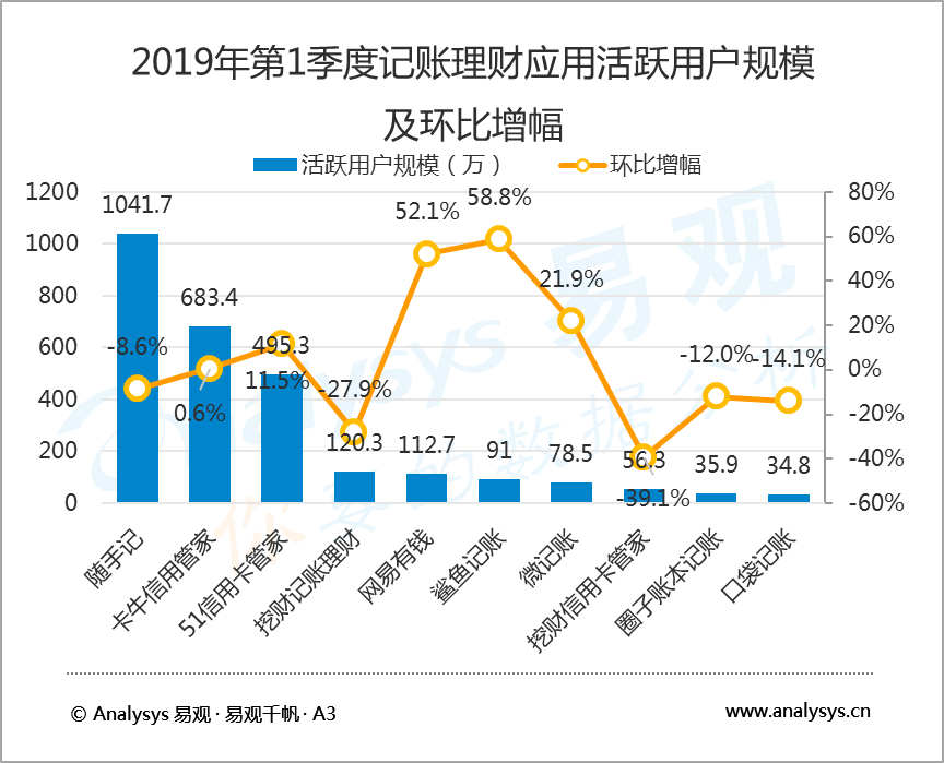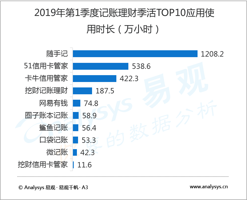 5月24日,知名互聯(lián)網(wǎng)數(shù)據(jù)研究機構(gòu)易觀 Analysys發(fā)布了2019年第1季度記賬理財行業(yè)報告,數(shù)據(jù)顯示,2019年第1季度,在國內(nèi)記賬類應(yīng)用中,隨手記以1041.7萬活躍用戶規(guī)模蟬聯(lián)榜首,卡牛信用管家和51信用卡管家分別以683.4萬和495.3萬活躍用戶規(guī)模居行業(yè)二、三位。