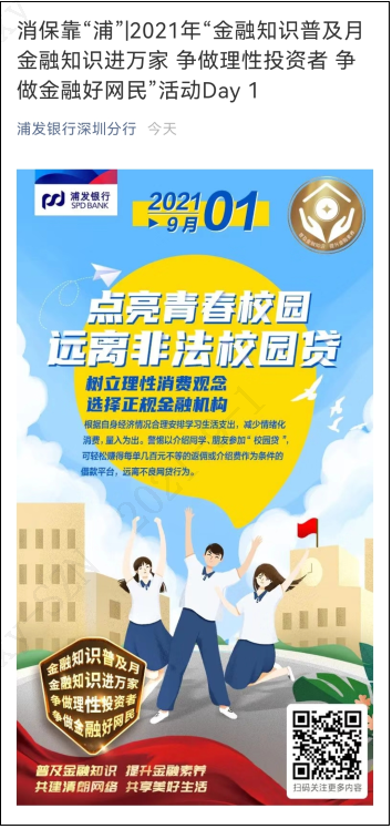 9月1日,也是校園開學的日子。開學的第一天,浦發銀行深圳分行特別推出“點亮青春校園遠離非法校園貸”日歷宣傳海報,并在官方微信公眾號進行轉發宣傳,同時在46家網點營業大廳顯示屏播放,重點傳播校園貸金融知識,提醒學生人群,合理消費,遠離不良網貸行為。據悉,該行將在九月每個工作日持續發布消保宣傳日歷,常態化長效推進金融知識普及月宣傳活動的開展。
