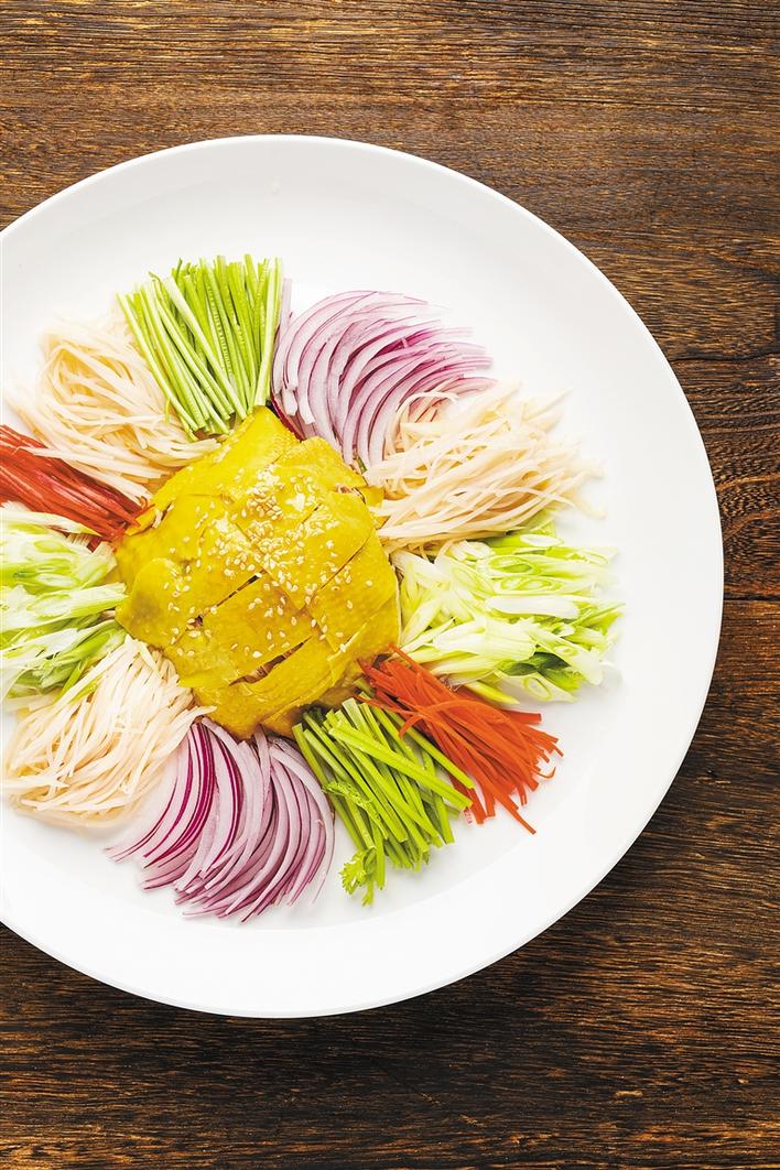 “撈”在粵語中有工作有錢賺的意思,祝愿來年風生水起。徐師傅采用遠近馳名的葵花雞。葵花雞顧名思義,由新鮮的葵花盤、葉、桿等炮制而成的飼料喂養,以葵花桿榨成的汁解渴,是十足的“雞中貴族”。徐師傅選用講究的雞肉來準備這道講究的菜,寓意前來用餐的賓客在來年可以步步高升、事事順利。將葵花雞、子姜絲、洋蔥絲、香菜段等各式新鮮食材撈到一起,齊齊起筷,高呼:“齊齊撈起,撈到風生水起!”