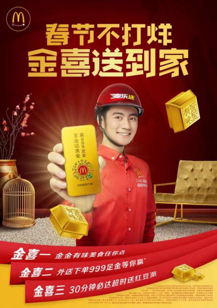 麥當勞外送服務(wù)麥樂送在春節(jié)期間也加入“金金”有味的體驗,為餐廳以外的顧客送出三重“金”喜:全系列新品登陸麥樂送平臺,通過麥當勞官方渠道和第三方訂餐平臺都可以下單;麥樂送下單也可以參與抽獎,贏取周大福足金;春節(jié)期間美食30分鐘必達,超時將贈送紅豆派。