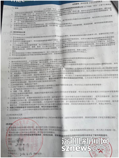 段女士告訴記者,2014年她在網上與美聯英語的客服人員取得聯系后,便前往南山區海印長城二期1-2層的美聯英語中心試聽課程,并于當年4月報讀了M0—M4五個級別共31800元的課程。段女士當時選擇的是分期付款方式,在完成首付3200元后,其余的金額由銀行每月自動扣除1100余元。截至目前,段女士已連續繳費22個月。