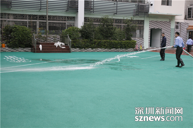 羅湖螺嶺外國語實驗學校二部通過沖水的方式,清除跑道的異味
