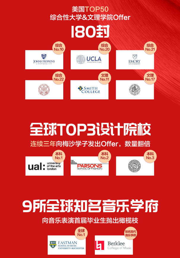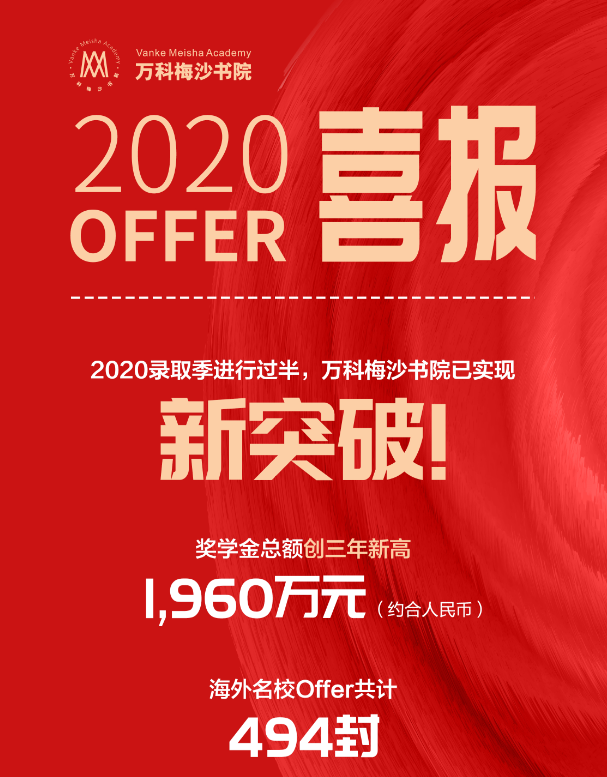 2020申請季還未結束,梅沙學子已收獲494封海外名校錄取Offer,獎學金累計約合人民幣1,960萬元,創三年新高。其中,來自美國Top100綜合性大學及文理學院的錄取通知書有356份,來自美國Top50綜合性大學及文理學院的錄取通知書有180份。