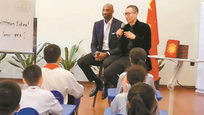 參加完籃球世界杯抽簽后的科比如約來到蛇口太子灣學校,給學生們上了一節課,同時還開了一個新書見面會。