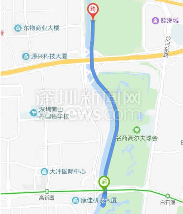 該網(wǎng)友在帖文中稱,聽聞濱海沙河西立交橋下到深南沙河西天橋的騎行路段今年9月份開通了,于是他周末帶著孩子沿沙河?xùn)|側(cè)騎行,準備一睹深圳最美騎行路段的風(fēng)景。由于周末限騎行原則,該網(wǎng)友被迫輾轉(zhuǎn)數(shù)次才到達大沙河公園。具體騎行路程如下: