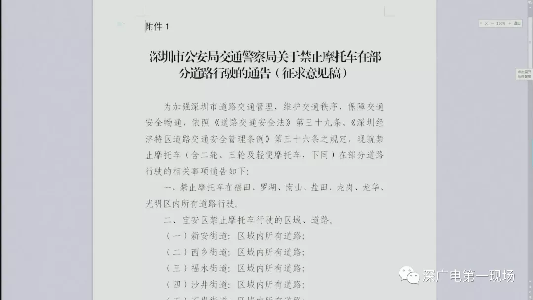 在征求意見結束后,交警部門共收到相關管理部門、涉摩行業、市民群眾、人大代表、政協委員等群體345條反饋意見和建議,意見總共有三個方向,其中第一個方向全面取消禁摩令管理措施,要全面放開摩托車,讓摩托車在全市道路通行,有62條意見,主要來自涉摩愛好者、市民群眾,占所有反饋意見18%,交警明確表示,目前對于這個方向的意見是不予采納的,在深圳市涉摩兩搶案件已基本杜絕的前提下,在機動車保有量、密度及道路通行條件允許并支持的情況下,可以適當放開摩托車通行,但暫時無法做到全面放開。