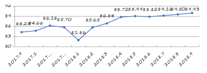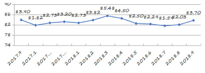 國家統(tǒng)計局深圳調查隊編制9月份深圳市城市交通文明指數(shù)為87.02分,比上月增加0.05分,比上年同期增加2.06分;深圳市城市交通文明進步指數(shù)為-0.05 % (見圖1)。