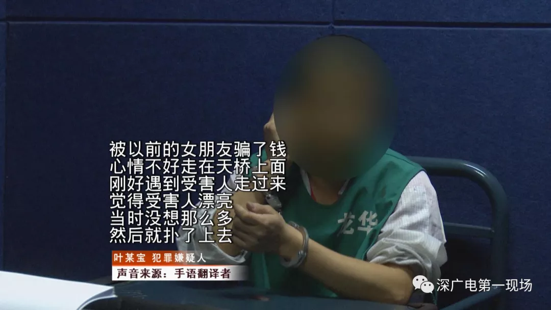 今天上午,記者在龍華油松派出所,見到了犯罪嫌疑人葉某寶。葉某寶是安徽人,今年31歲,在龍華區某工廠工作。在采訪時,記者發現,犯罪嫌疑人葉某寶是名聽障人士,通過手語交談后了解到,11月2號晚上七點多,他途經建設東路人行天橋時,對小王起了“歹心”。