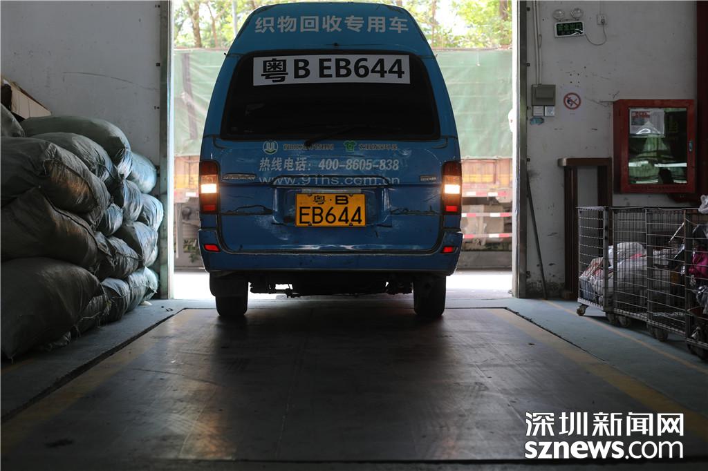 在福田區梅林一村的近停車場入口處,記者在幾乎要滿的織物回收箱前等待著該公司運輸車輛的到來。不久后,一輛噴涂有織物回收專用車字樣的面包車進入了停車場。據介紹,該車輛噴涂為政府統一要求,進行廢舊織物回收的作業的車輛需要有統一的涂裝。