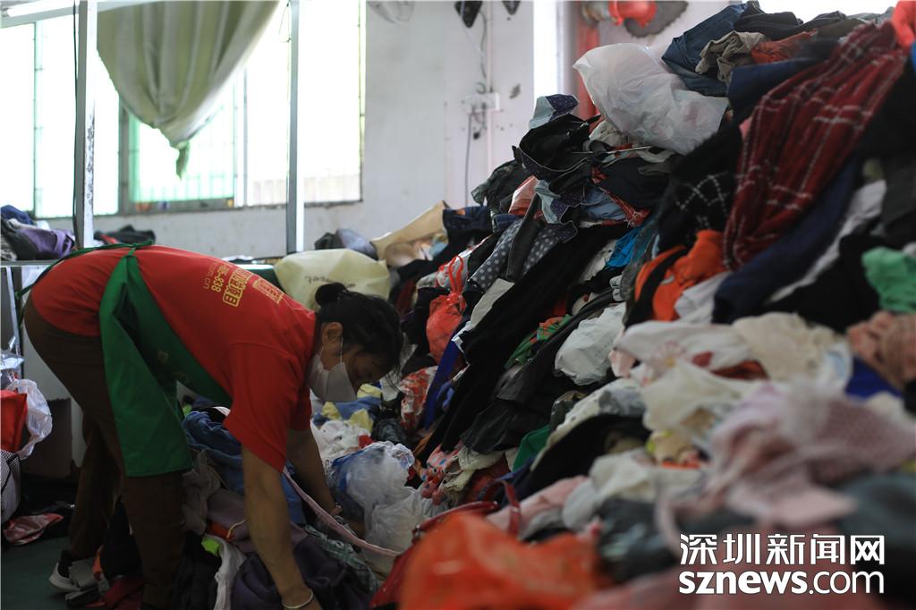 有人高的“衣山”,工作人員進行初步篩選