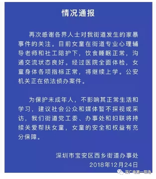 12月24日晚,深圳市寶安區西鄉街道辦通報表示:目前女童在街道專業心理輔導老師和社工陪護下,飲食睡眠正常,溝通交流狀態良好。經過醫院全面體檢,女童身體各項指標正常,將繼續上學。
