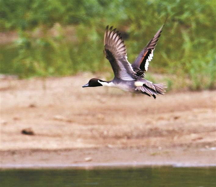 2號魚塘東側的3號魚塘里,則聚集著近千只普通鸕鶿、一小群黑翅長腳鷸和針尾鴨等候鳥。兩只斑魚狗在空中不停穿梭著,搜尋著它們的午餐。當發現目標的時候,它們會快速地扇動雙翼,讓自己懸停在空中,然后突然間像一支離弦之箭一樣直刺水面,閃電般的一擊之后,未等水花落下,它們已經叼著一條仍在拼命掙扎的魚兒,飛到岸邊的樹叢中去享用大餐去了。