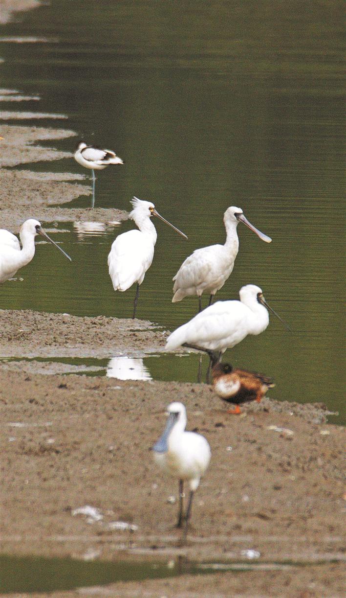 中午12時許,福田紅樹林國家級保護區的2號魚塘里,已經聚集了45只珍稀候鳥——黑臉琵鷺。在它們身邊,還有數百只反嘴鷸、針尾鴨、綠翅鴨、琵嘴鴨、赤頸鴨、青腳鷸等候鳥在水中忙著覓食。