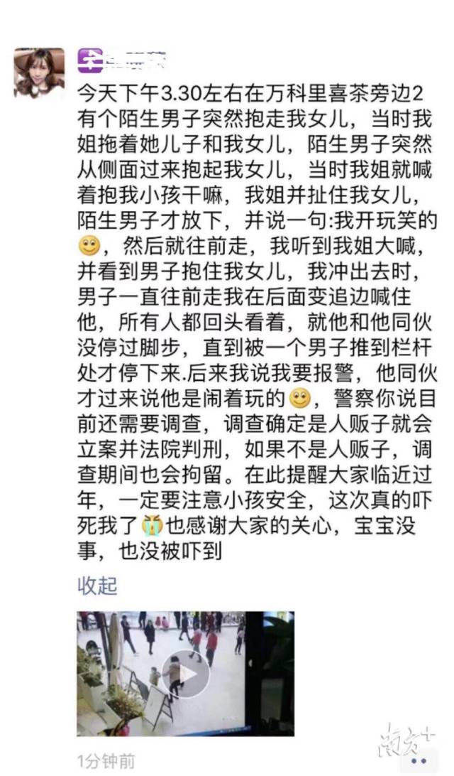 2019年1月1日下午,一位市民發朋友圈表示:在萬科里逛街時,一名陌生男子突然上前抱走她的女兒,經過拉扯制止,該男子才放下孩子。隨后,該女士報警,而男子則表示自己是鬧著玩的。