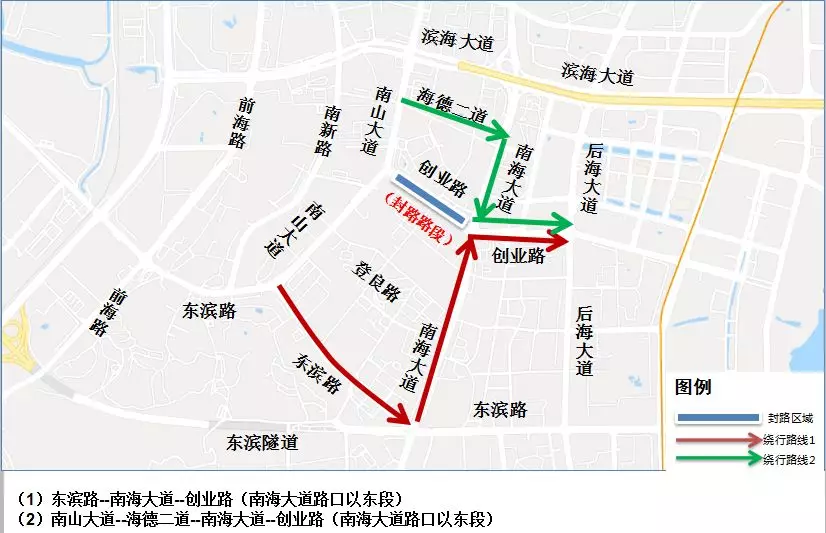②路口北行車輛,一是可繼續沿南海大道北行至濱海南海立交橋下掉頭,再經過海德二道轉入南山大道通行;二是在南海大道創業路口掉頭,再經登良路轉入南山大道通行;三是改沿東濱路西行,再轉入南山大道通行。