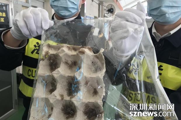 3月18日16時許,一名兩地牌小客車司機駕車從皇崗口岸客運小車道入境。海關依法對車輛進行檢查,關員發現車廂內放置有3個白色塑料袋,袋內存在封裝好的大量活體昆蟲,塑料袋里三片看起來并不起眼的紙殼里,竟然存養著超過600只活體蟋蟀,含包裝重量約為460克。