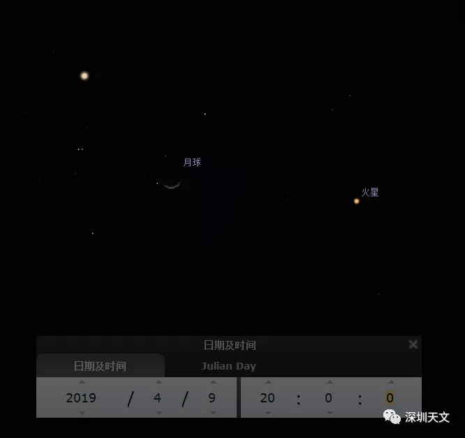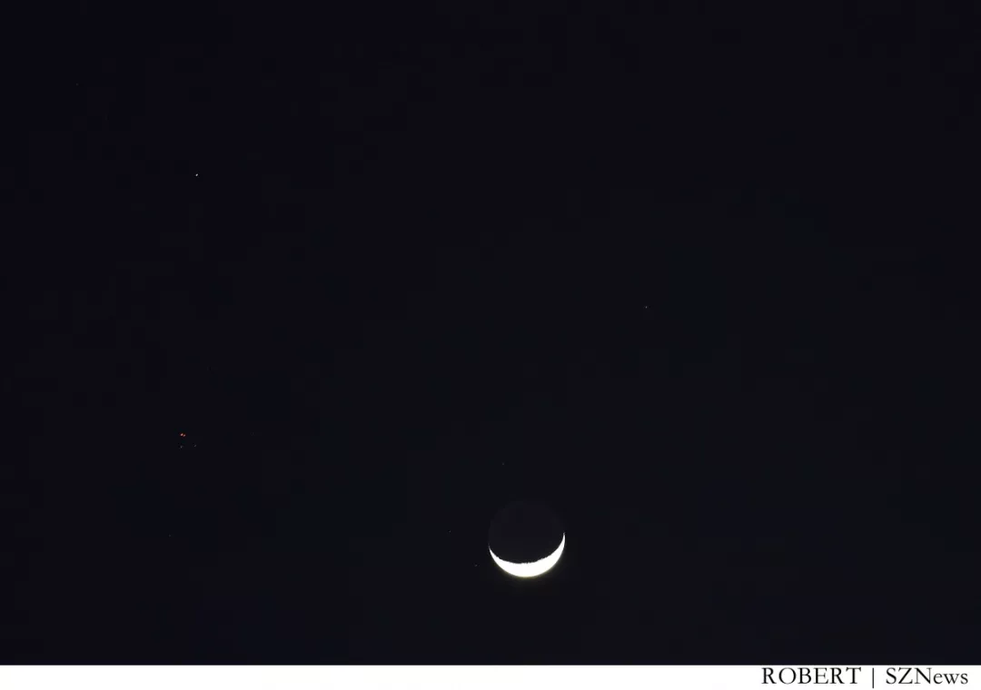 昨晚(4月9日),農(nóng)歷初五,機緣巧合,彎彎的月亮將從亮恒星畢宿五和大行星火星的中間路過。三者相聚在一起,形成“雙星伴月”的有趣天象。更有趣的是,三者擺成了一張笑臉的模樣:左上方的畢宿五為左眼睛,右方的火星為右眼睛,中間的月亮為嘴巴。