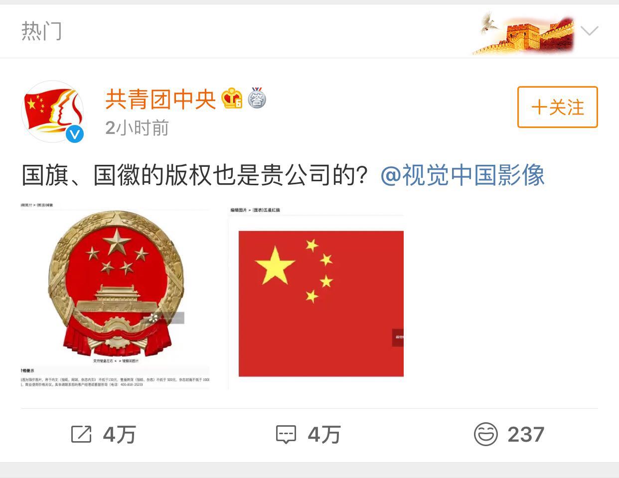 說個(gè)題外話,聽說這黑洞照片的版權(quán)是視覺中國的。。。還聽說國徽、國旗的版權(quán)也是視覺中國的