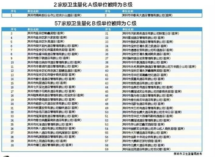 5、深圳市衛生監督部門自2018年12月開始集中開展專項整治行動。截至目前,行動中共檢查1660家酒店業單位,責令限期整改224家,立案95宗,共有59家單位在衛生信譽等級評定復審工作中被予以“降級”,其中不乏部分知名連鎖酒店業單位。