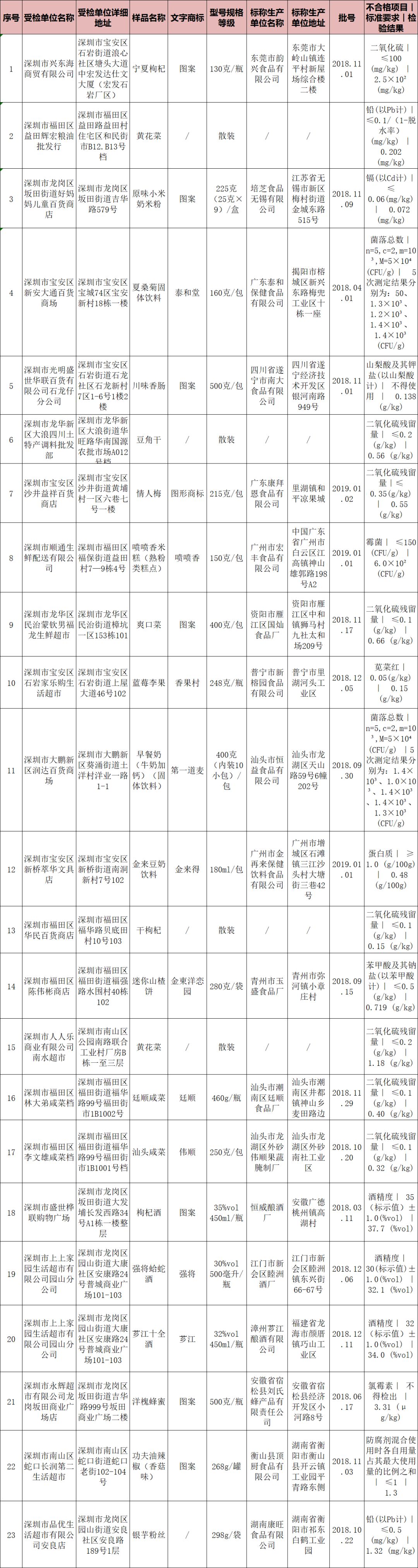 本次共抽檢流通環節食品2131批次,涉及流通環節經營主體529家次,共檢測食品指標13373項次。其中檢出不合格樣品23批次,涉及不合格食品類別有茶葉及相關制品1批次,淀粉及淀粉制品1批次,蜂產品1批次,糕點1批次,酒類3批次,肉制品1批次,蔬菜制品6批次,水果制品4批次,特殊膳食食品1批次,調味品1批次,飲料3批次;涉及不合格項目類別為獸藥殘留、金屬等元素污染、微生物污染、食品添加劑、品質指標。