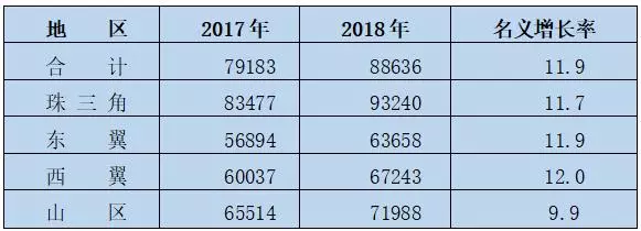 城鎮非私營單位的排名則為珠三角、山區、西翼、東翼,分別是93240元、71988元、67243元和63658元;同比名義增長率從高到低依次為西翼12.0%、東翼11.9%、珠三角11.7%和山區9.9%。最高和最低區域的平均工資之比為1.46,比上年縮小0.01。