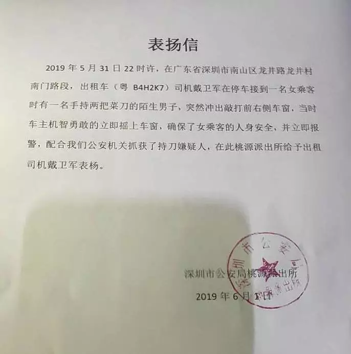 由于戴衛軍的冷靜處理,這起治安隱患事件發生不到半小時,涉案嫌疑人就被警方成功抓獲歸案。為了贊揚戴衛軍見義勇為的義舉,桃源派出所還專程向戴衛軍送上了表揚信。