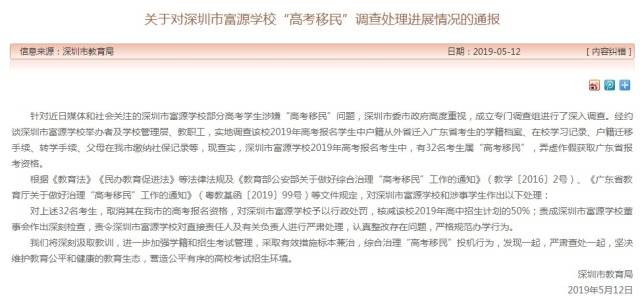 5月12日晚,深圳市教育局發布《關于對深圳市富源學?!案呖家泼瘛闭{查處理進展情況的通報》,通報稱,經查實,深圳市富源學校2019年高考報名考生中,有32名考生屬“高考移民”,弄虛作假獲取廣東省報考資格。按照相關法例,對涉事32名學生取消在深圳市的高考報名資格,對深圳市富源學校予以行政處罰,核減該校2019年高中招生計劃的50%;責成深圳市富源學校董事會作出深刻檢查,責令深圳市富源學校對直接責任人及有關負責人進行嚴肅處理,認真整改存在問題,嚴格規范辦學行為。