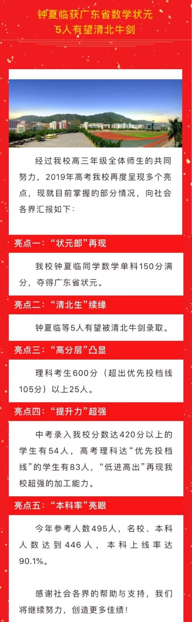 學校稱其2019年高校“高分層”凸顯,理科考生600分(超出優先投檔線105分)以上25人;“本科率”亮眼,今年參考人數495人,名校、本科人數達到446人,本科上線率達90.1%;此外,還提到“提升力”,稱中考錄入該校分數達420分以上的學生有54人,高考理科達“優先投檔線”的學生有83人,實現“低進高出”。