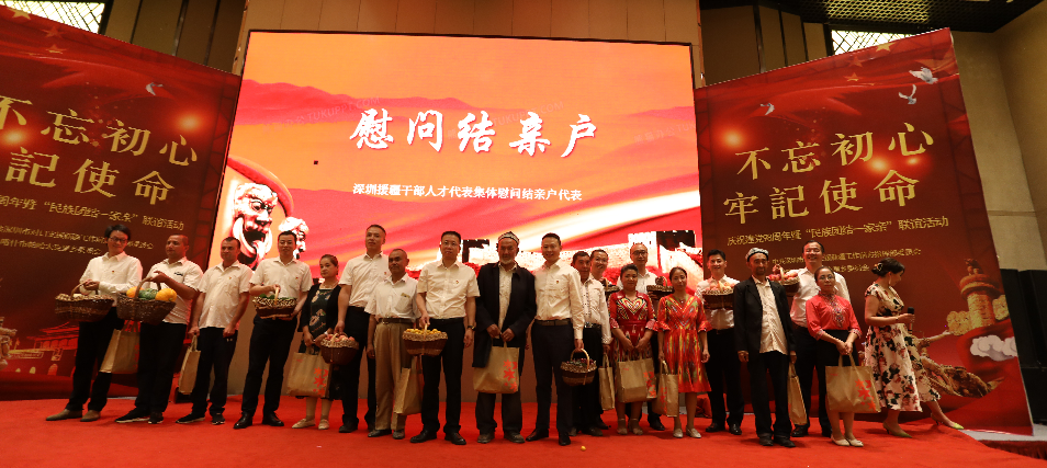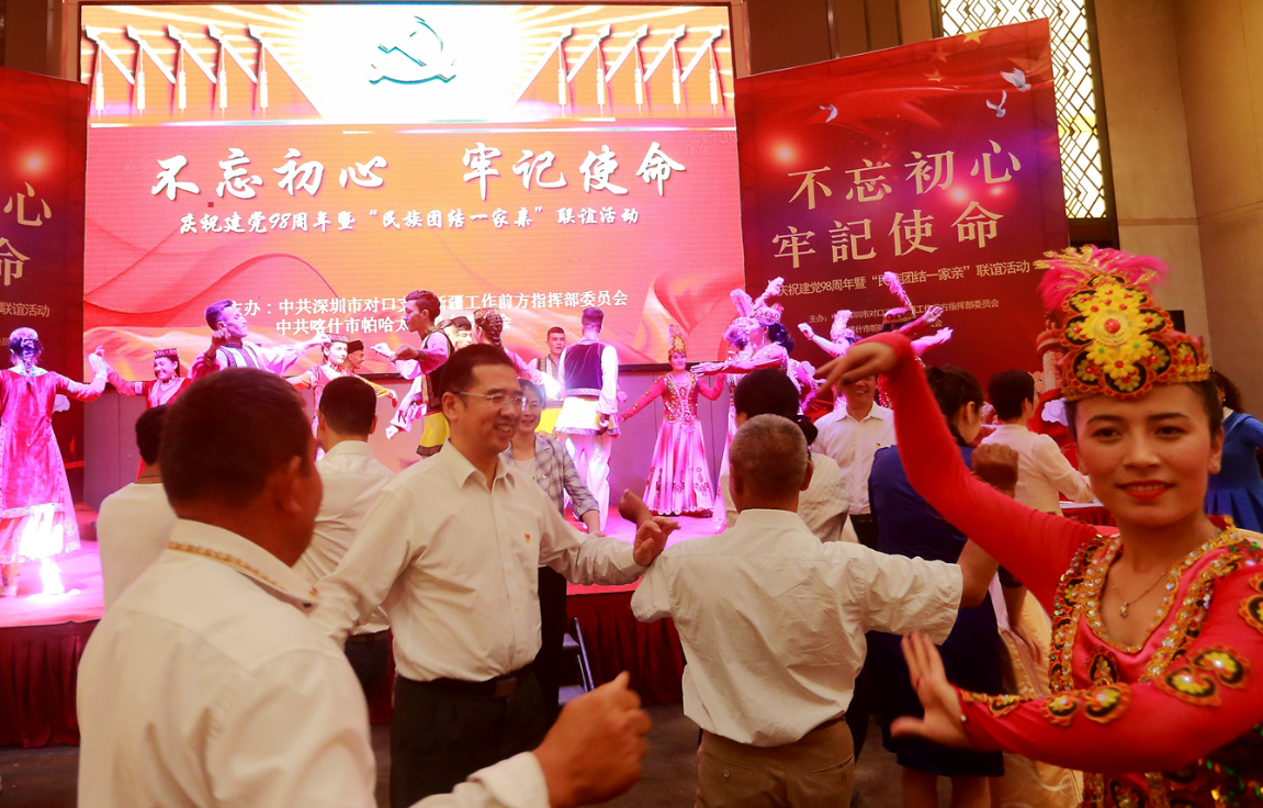 “歷史告訴我們,沒(méi)有共產(chǎn)黨,就沒(méi)有新中國(guó);沒(méi)有共產(chǎn)黨,也沒(méi)有我們新疆各族人民今天的幸福生活,在這個(gè)特殊的日子里,讓我們繼續(xù)攜起手來(lái),不忘初心,牢記使命,緊密團(tuán)結(jié)在以習(xí)近平同志為核心的黨中央周?chē)?tīng)黨話,跟黨走,挑起重?fù)?dān),勇當(dāng)尖兵,共同為實(shí)現(xiàn)新疆社會(huì)穩(wěn)定和長(zhǎng)治久安總目標(biāo),為受援地打贏脫貧攻堅(jiān)戰(zhàn)而努力奮斗!”深圳援疆前方指揮部總指揮楊春生在致辭中說(shuō)到。