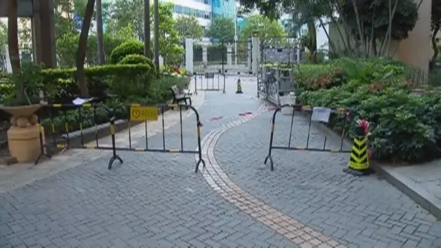 事發后,在一旁的樓層,一戶高層也在進行維修窗戶。物業管理處立即在一樓對應的區域加裝了警戒圍擋,防止高空墜物。