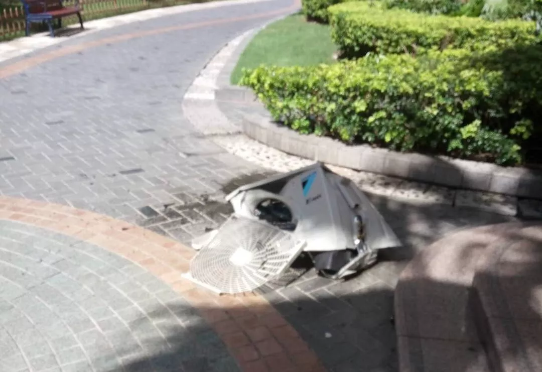 據了解,空調主機從2棟中間樓層的一戶業主家掉落的,當時安裝工人正在挪動主機,中途意外脫手,萬幸沒有傷到人。