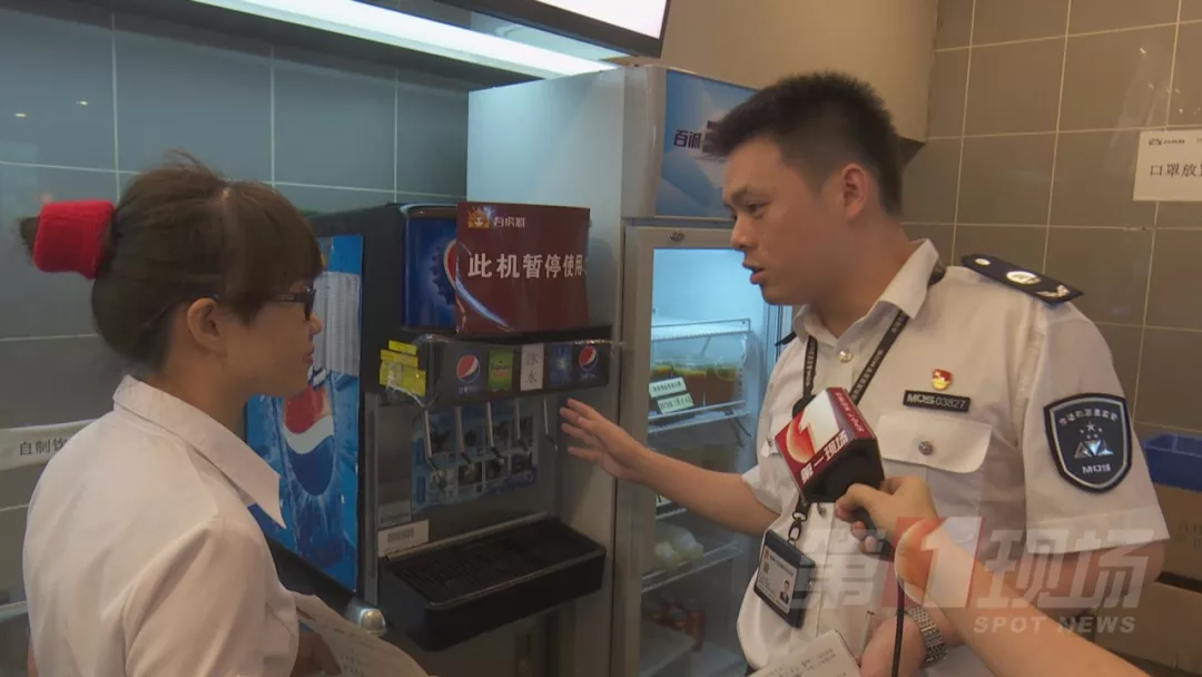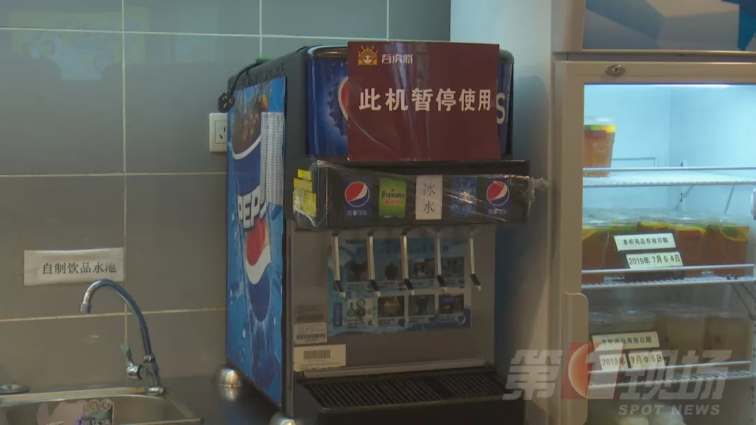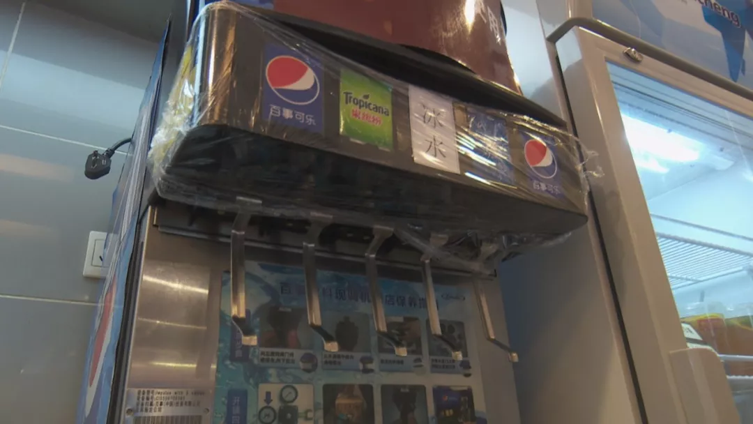今天中午,記者跟隨轄區市監所執法人員來到涉事門店現場檢查。據了解,2號事發后,店里的這臺飲料機已經暫停使用,目前飲料出口是用保鮮膜封住的。店方稱,飲料機,每個月由百事可樂廠家人員深層清洗一次,他們的員工是每天對飲料機的糖漿管道和濾嘴進行清洗,都有清洗記錄。