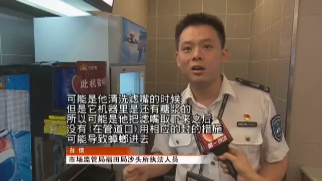 可能是他清洗濾嘴的時候,里面是個管道是空的,但是它機器里是還有糖漿的。這種糖漿特別容易吸引蟑螂或者異物進去,所以可能是他把濾嘴取下來之后,沒有用封的措施,可能導致蟑螂進去。然后把濾嘴裝上去 ,再可樂倒出來的時候,可能蟑螂就跟一起出來了 。
