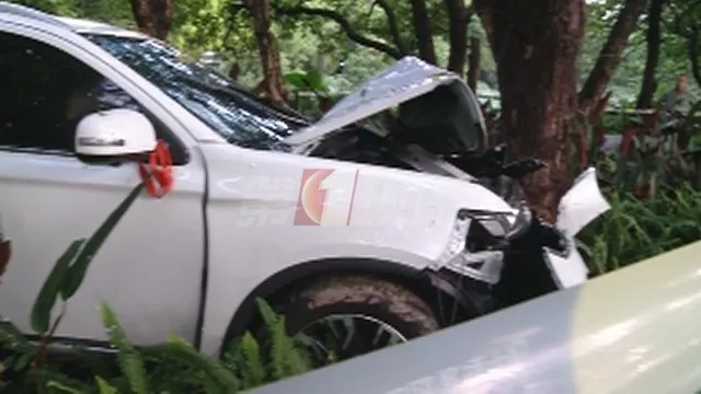 事情發生在7月21日下午3點50分,在事發現場可以看到一輛白色三菱汽車撞到了一棵樹,車頭被撞得完全凹陷,支離破碎。