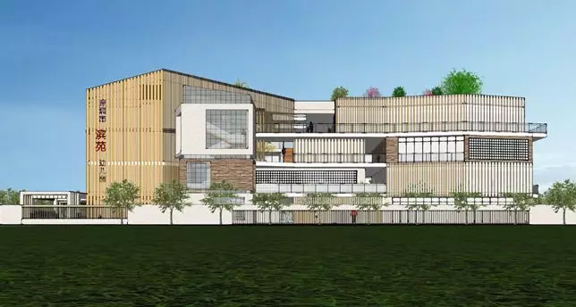 建筑造型簡潔現代,在白色體量上嵌入三個木色坡屋頂體塊,如積木城堡一般,富有童趣,建筑設有集中活動平臺作為補充。