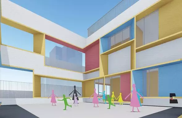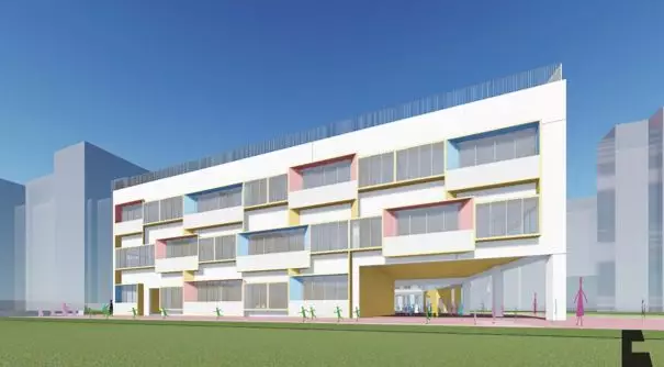 退距和滿足日照是首要解決的兩大問題。項目與周邊多層住宅距離較近,在被3小時日照線及周邊建筑最近點的18米范圍線切割的用地上布置幼兒生活用房,同時保證主要的幼兒生活用房(即班級活動單元)滿足日照情況下,自然形成了扭動的班級活動單元,借這個扭動形成了本案的設計理念:(糖果盒子、愛與信念)。建筑造型反映新、奇、趣、美的建筑個性風格。