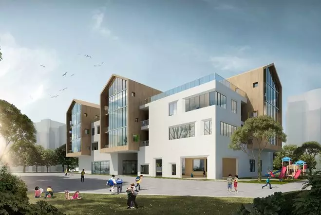 項目打破傳統整齊排列的布局方式,打造出4個與邊界呼應的靈活體塊,在保證幼兒園首層活動空間完整最大化的同時,將新舊校舍結合,打造一個聯通式共享庭院。新建校舍為每一個班級都提供了專屬的室內外無邊界活動空間。除首層班級與室外活動空間直接連通以外,二、三層班級外設有錯落的活動露臺及挑檐,實現每層均可嬉戲、游樂、探索的布局。