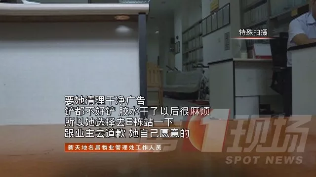 當時這名女子在小區E棟樓層里張貼小廣告,物業發現后把她帶到管理處,要求她自行清理掉自己張貼的所有廣告,或者道歉,二者選其一。