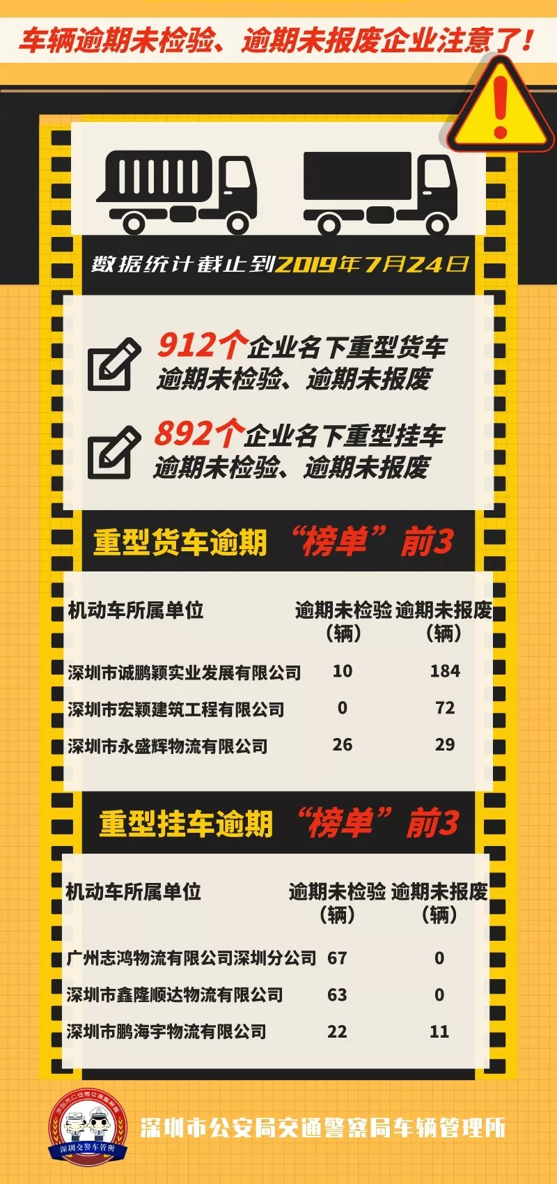 見圳客戶端·深圳新聞網2019年7月26日訊(見圳客戶端 深圳新聞網記者 何暢)車輛逾期未檢驗、逾期未報廢,存在著重大交通安全隱患,深圳部分企業不重視安全管理、名下有大量“問題車輛”未處理。7月26日“深圳交警權威發布”微信公眾號就對相關企業進行了點名曝光。