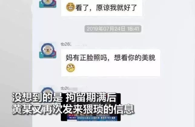 本以為事情就這么過去了,可沒想到,黃某被釋放后,這兩天又發來騷擾信息,而且內容變本加厲,讓當事人姬女士再一次陷入漩渦之中。
