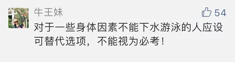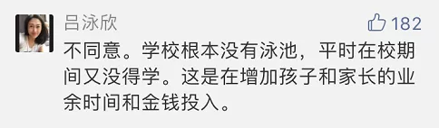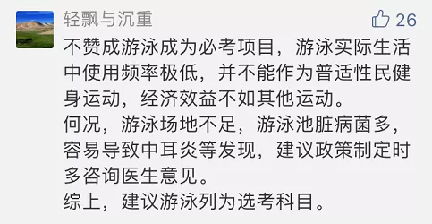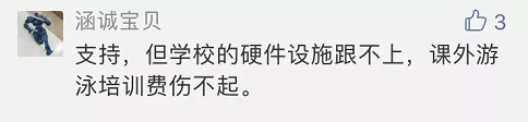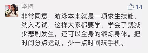 對于游泳納入中考體育必考選項,家長們的看法不一。支持者認為,“游泳本來就是一項求生技能,納入考試,孩子們都要學習,除了鍛煉身體,還能減少意外的發生。”也有人認為“很多學校都沒有開設游泳課,學習硬件設施跟不上也白搭。”反對者則認為,“游泳實際生活中使用頻率極低,并不能作為普適性健身運動,納入選考更合適”“學校的硬件設施跟不上,課外游泳培訓費傷不起。”