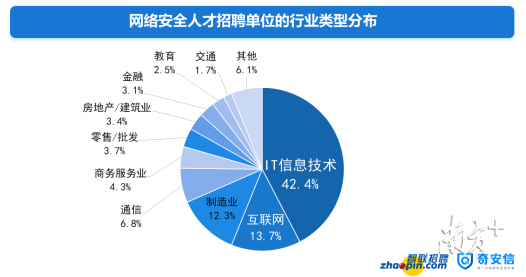從用人單位的所屬行業來看,IT信息技術和互聯網行業對網絡安全人才需求量明顯高于其他行業,分別占到了總量的42.4%和13.7%。需求排名第三的是制造業,招聘數量占比12.3%。通信行業(6.8%)、商務服務業(4.3%)等排在其后。
