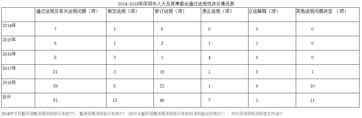 2018年,深圳在立法保障改革、立法推動改革、立法規范改革方面的步伐越邁越大,在加大特區立法權使用,制定特區條例促進改革創新和保障經濟社會發展外,根據改革的需要,及時修改和廢止與經濟社會發展不相符的法規,采用暫停法規性文件的適用、暫時調整和暫停法規部分條款適用的方式,為改革探索提供法治依據。全年通過新的特區條例5項,修訂法規23項,廢止法規1項,暫時調整和暫停適用法規10項。