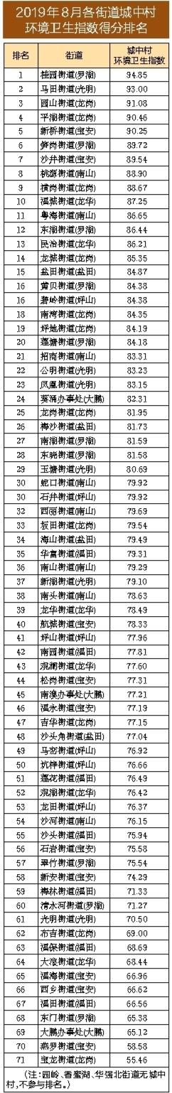 全市城中村首次單獨“應考”,成績如何?根據公布的測評結果,深圳市城中村環境衛生指數為79.05分,光明區、羅湖區、龍崗區城中村環境衛生指數位列三甲,城中村人口密度較大的福田區則在首次公布的城中村環境衛生指數排名中墊底。排名前3的街道分別是桂園街道(羅湖)、馬田街道(光明)和園山街道(龍崗),而排名后3的街道分別是寶龍街道(龍崗)、燕羅街道(寶安)和大鵬辦事處(大鵬)。