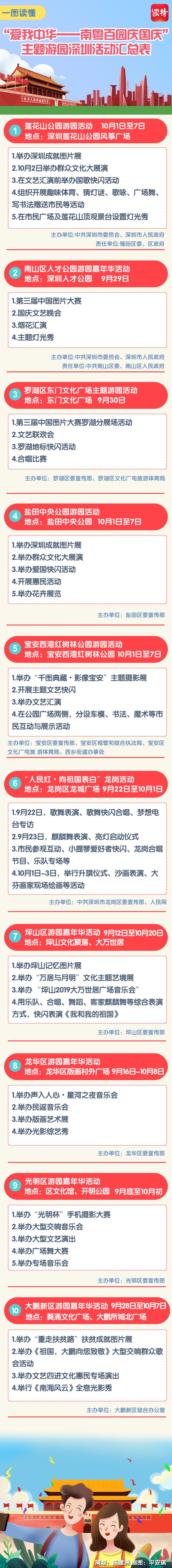 為慶祝中華人民共和國成立70周年,深圳市將舉辦專場音樂會、群眾文藝晚會、焰火晚會等活動,同時將舉行10場“愛我中華——南粵百園慶國慶”主題游園及80場“我和我的祖國”國慶群眾文藝嘉年華活動。主題游園和文藝嘉年華活動安排如下: