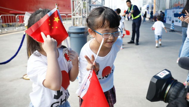 2019年10月14日,蛇口游輪母港CR2碼頭,兩位即將參觀“雪龍2”號(hào)科考破冰船的孩子們對(duì)起鏡頭比起手勢(shì)。