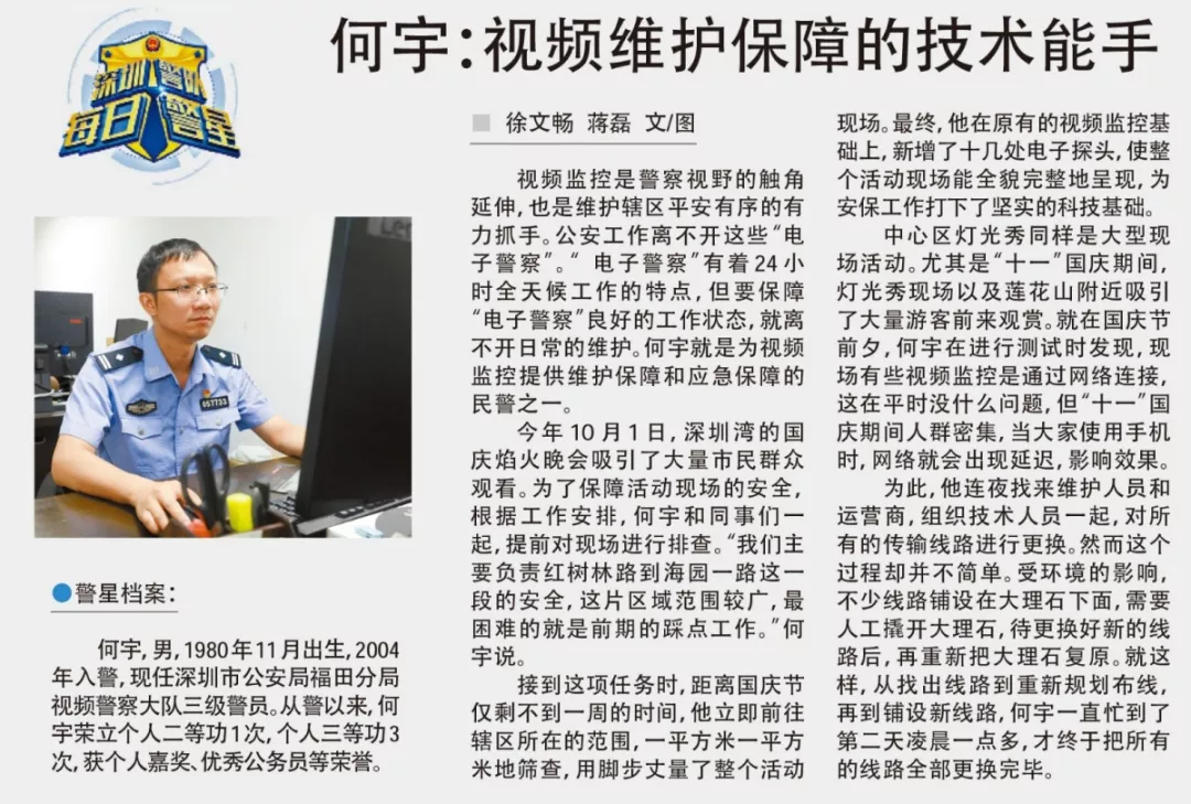 何宇,男,1980年11月出生,2004年入警,現任深圳市公安局福田分局視頻警察大隊三級警員。從警以來,何宇榮立個人二等功1次,個人三等功3次,獲個人嘉獎、優秀公務員等榮譽。