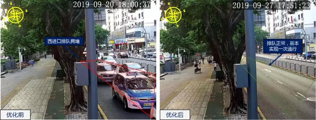 梅華/梅村路口位于梅林片區,周邊商業住宅小區密集,早晚高峰通勤需求大。為保障行人過街安全,7月份以來,路口加裝了控右箭頭信號燈,同時為了解決人車交織問題,增加了行人專用相位,由于相位增多周期上升,相應的右轉車輛通行效率會有所降低,導致高峰期出現東行排隊較長的情況。