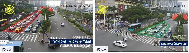 針對(duì)這一問(wèn)題,深圳交警根據(jù)路口各時(shí)段、各方向的通勤需求,調(diào)整優(yōu)化了路口紅綠燈配時(shí)方案,適當(dāng)增加了擁堵方向時(shí)間。優(yōu)化后,路口晚高峰西往東方向車(chē)輛排隊(duì)由300多米降至60米左右,下降80%,車(chē)輛基本實(shí)現(xiàn)1次通行。